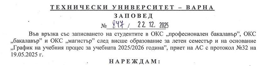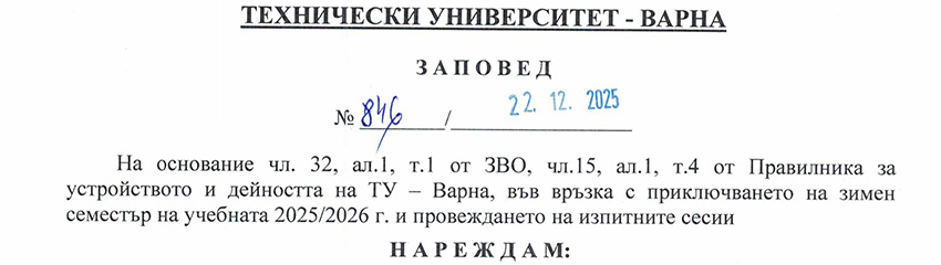 Заповед №846 във връзка с приключването на зимен семестър на учебната 2025/2026 г. и провеждането на изпитните сесии