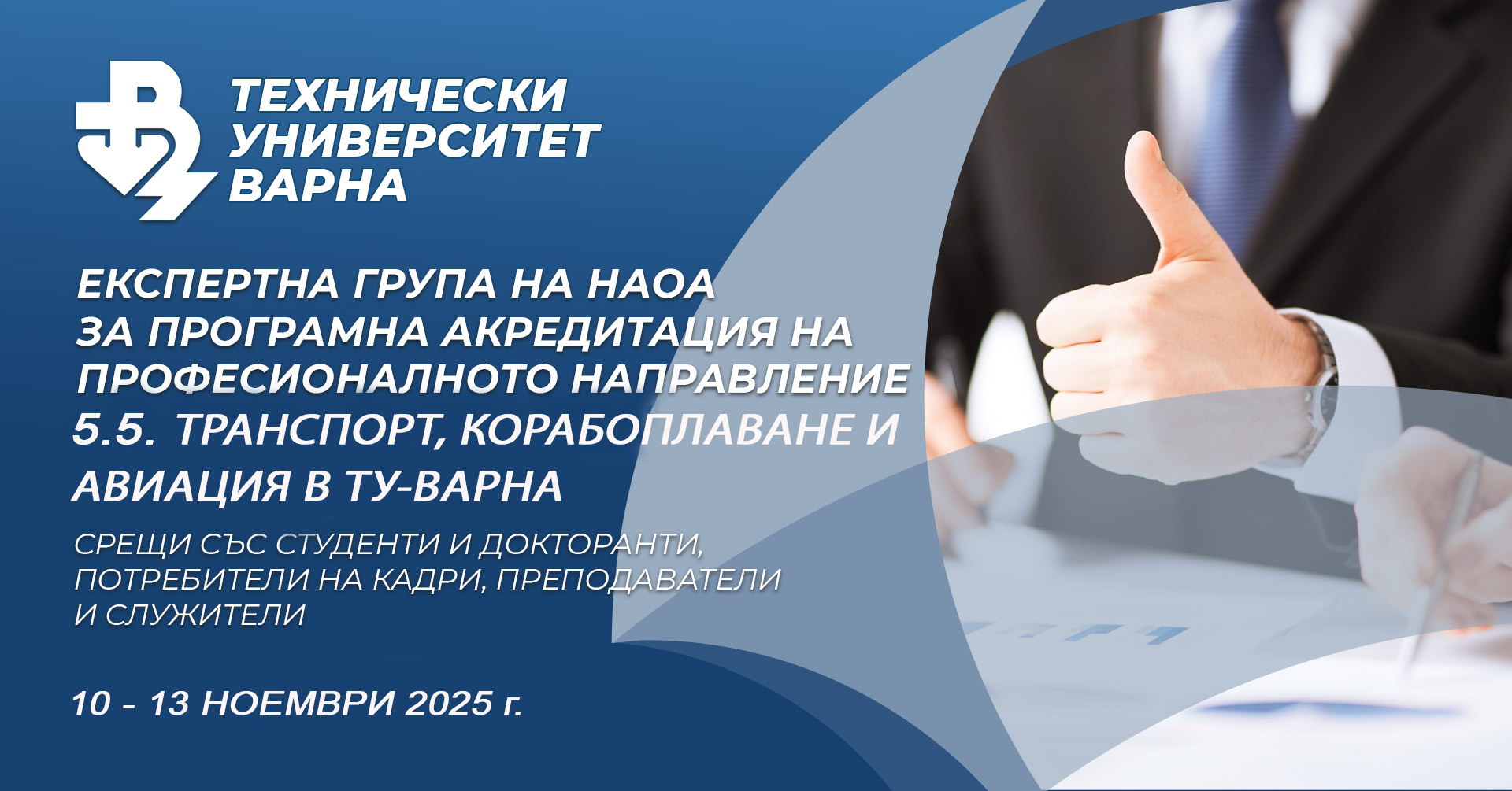 От 10 до 13 ноември 2025г. в Технически университет – Варна предстои посещение на Експертна група (ЕГ) на Националната агенция за оценяване и акредитация (НАОА) във връзка с процедура за програмна акредитация на професионалното направление 5.5 Транспорт, корабоплаване и авиация.