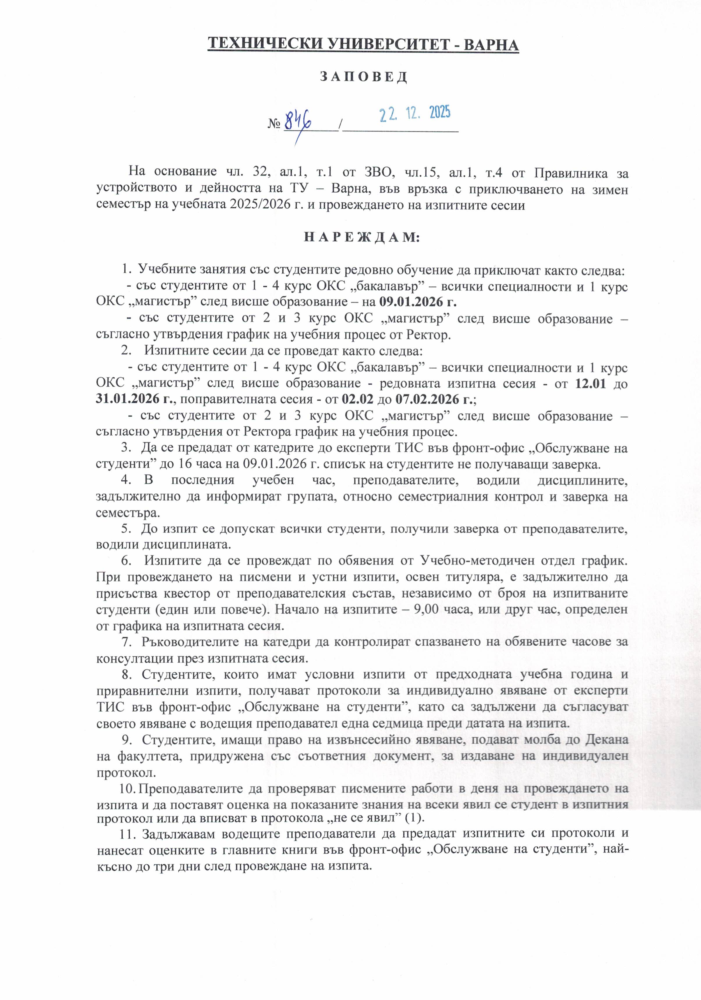 Заповед №846 във връзка с приключването на зимен семестър на учебната 2025/2026 г. и провеждането на изпитните сесии