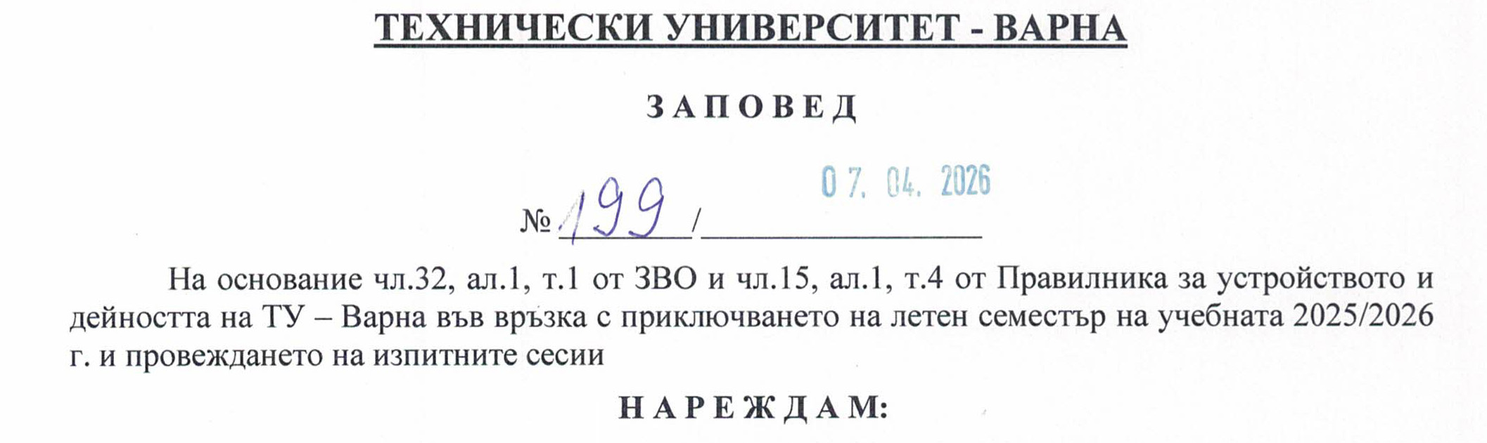 Заповед №199 във връзка с приключване на летен семестър на учебната 2025 / 2026г. и провеждане на изпитните сесии
